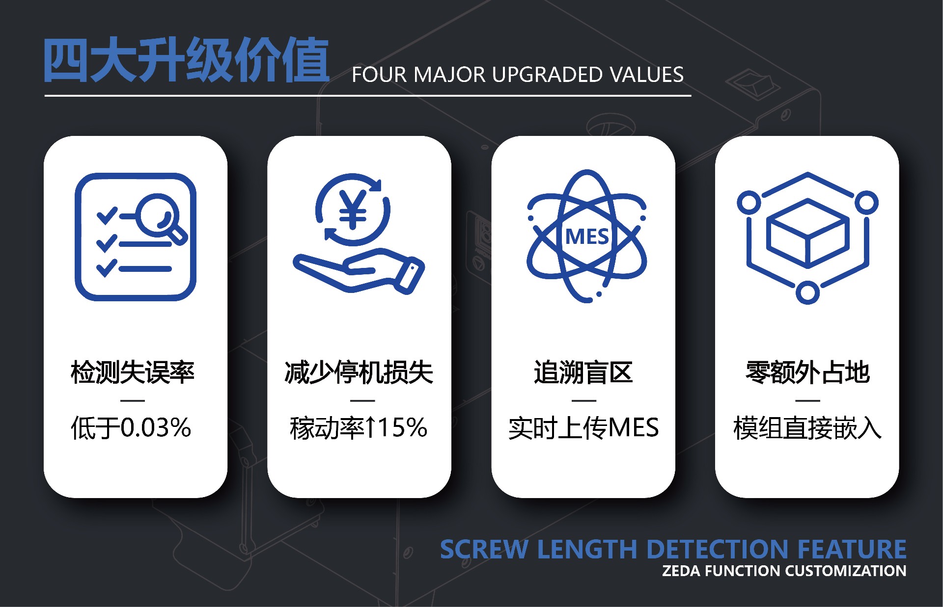 ①檢測(cè)失誤率低于0.03%:短螺絲/長(zhǎng)螺絲>99.9%攔截,滑牙、卡機(jī)、不良螺絲統(tǒng)統(tǒng)說(shuō)拜拜。